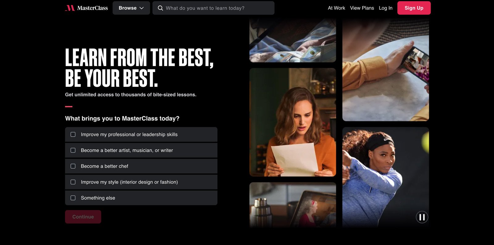 Take a look at how MasterClass communicates what they do right from the homepage while asking a question to gain insight into their audience’s needs.