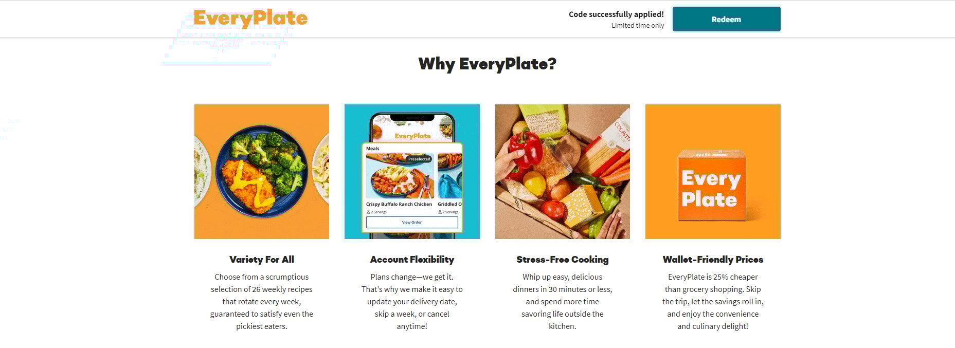 Think of a value proposition as a way that your company makes life better for people. You want it to be short and sweet but also direct. Your potential customer has a need and this is how you plan to meet it. Take EveryPlate for example. Meal planning can be a full time job, with EveryPlate you receive weekly recipes with the promise of stress free cooking within every budget.